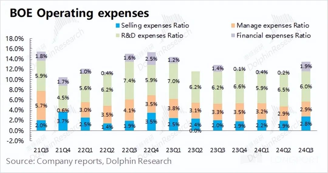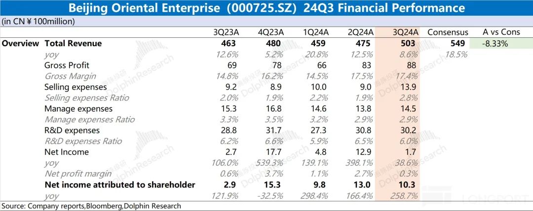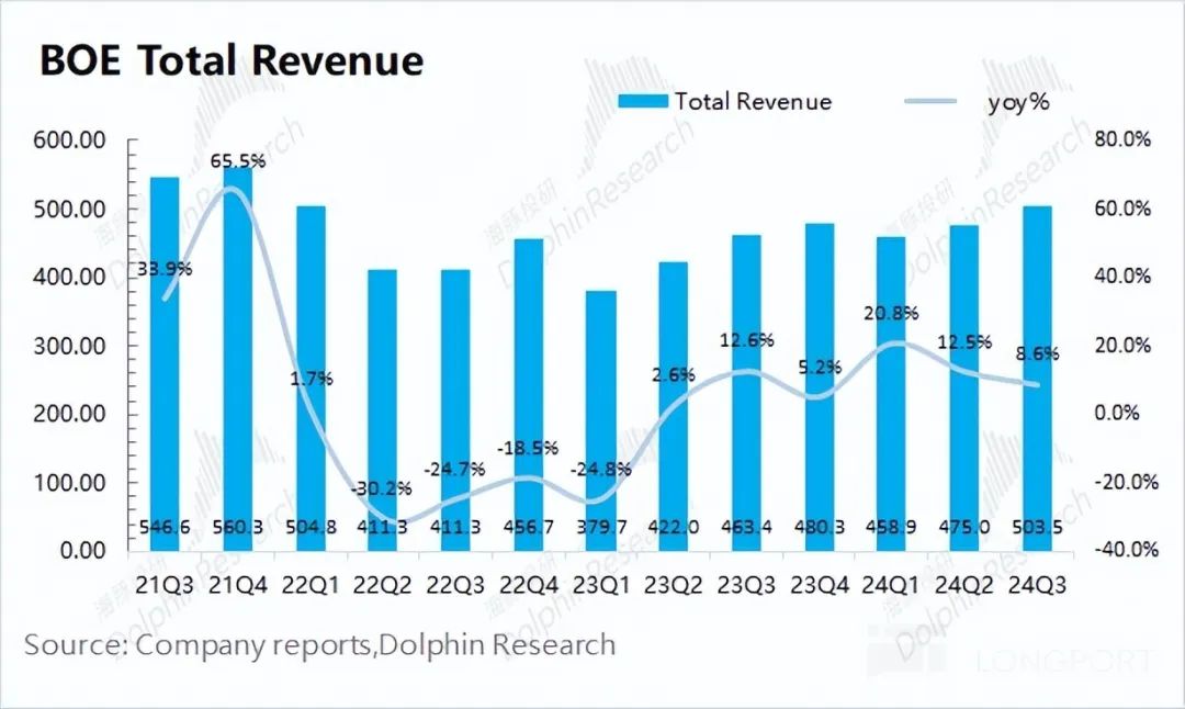 京东方在 2024 第三季度总收入 503 亿元,同比增长 8.6%,市场预测略低(549 十亿美元)。在过去的两年里,公司的季度收入回归 500 超过1亿元,主要是由于面板价格的上涨。