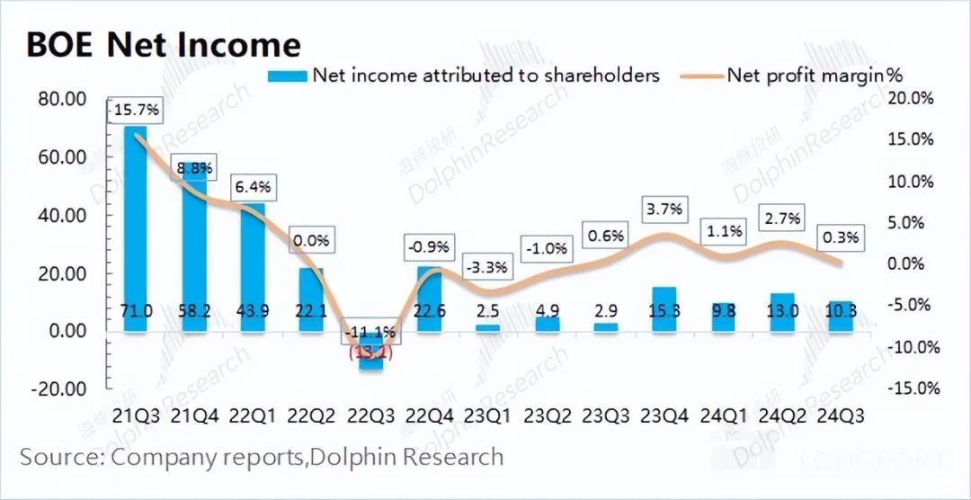 京东方在 2024 第三季度实现归母净利润 10.3 同比增长明显的亿元。企业业绩方面的回升,主要是受到面板价格上涨的推动。