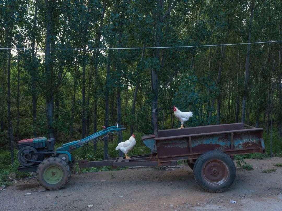 两只鸡站在拖拉机上。 邹城凉水泉 2022/8/24