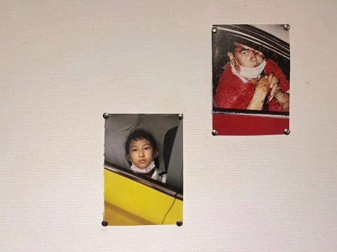 这面墙上的照片是我2021年夏秋之交的生活。2021年底制作成摄影集《停止许愿》。在展览呈现中,正版摄影集被拆解,内页直接粘在墙上,散落在两部大型作品之间。它显示了那段时间的静止状态...