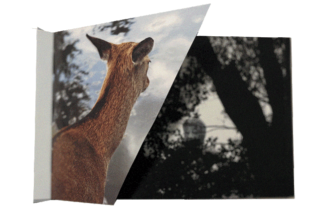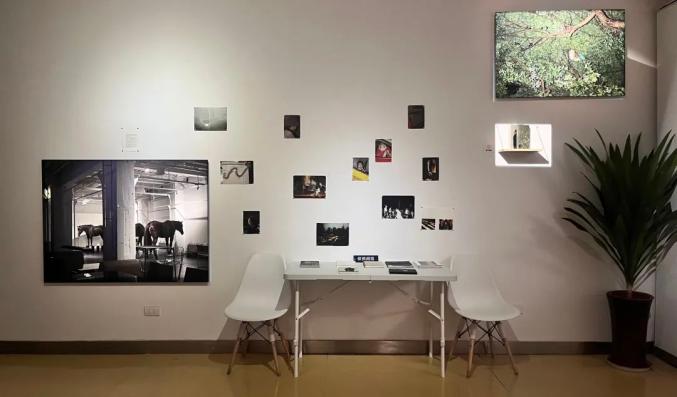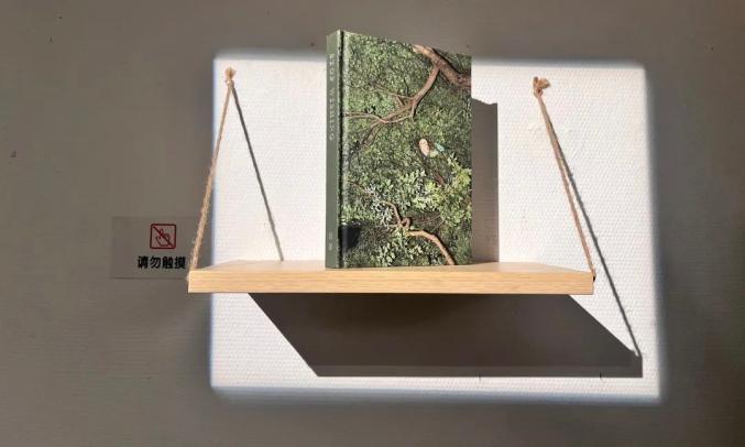 鸟粪右侧空间,六组照片横纵排列,墙上放置手工裁剪的“撕书”页面,两张图片之间产生“空间折叠”,观众可以阅读互动。