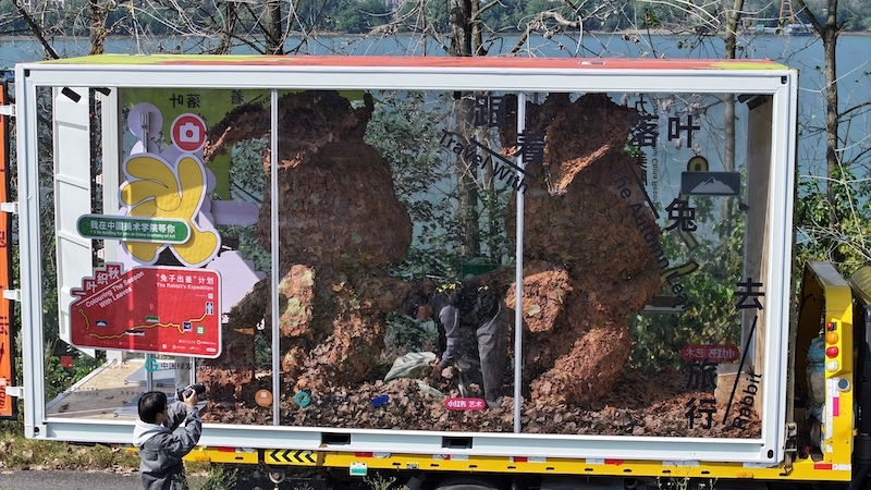 从萦绕江南到山谷奇境,两只由枯叶制成的“兔子”从杭州出发,巡游6天,一路向西行驶2670公里,来到九寨胜地。此后,中国美术学院在九寨举办了“秋叶艺术节”,展示了“枯叶兔出差”沿途收集的13件秋叶搭建的装置艺术,对话了当地的自然风光和民俗。