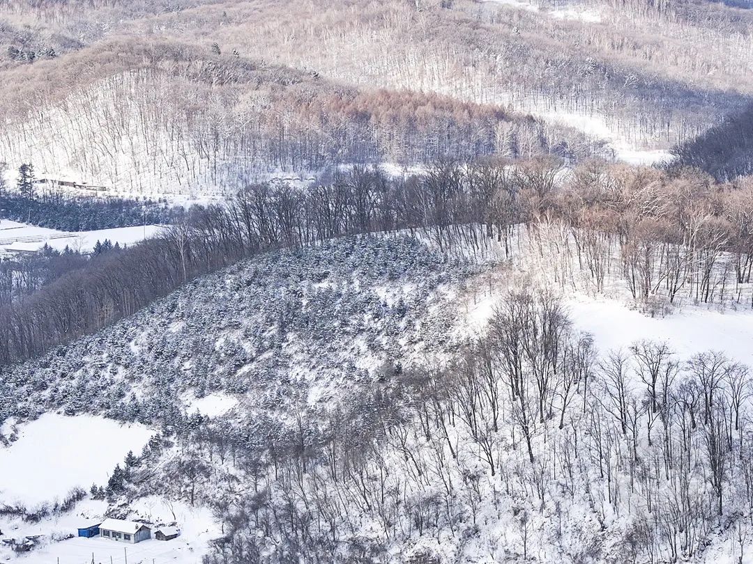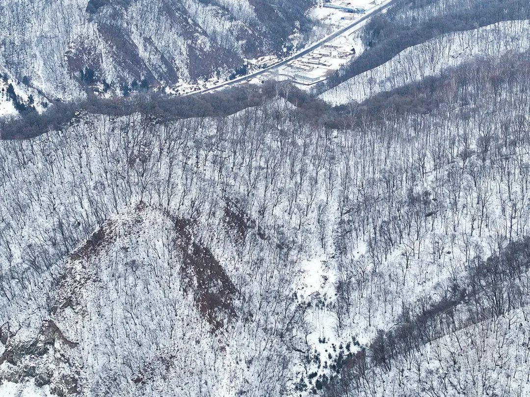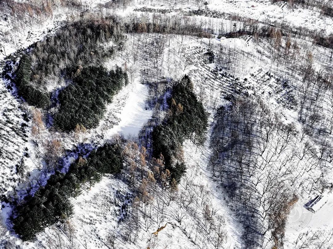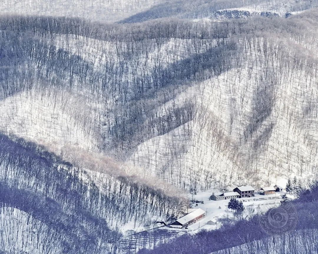 吉林雪山的自然景观极其壮观,雪山、冰河、森林和溪流共同构成了一幅美丽的画面。在这样的背景下,几栋造型独特的房子点缀其中,构成了一幅人与自然和谐共处的画面。