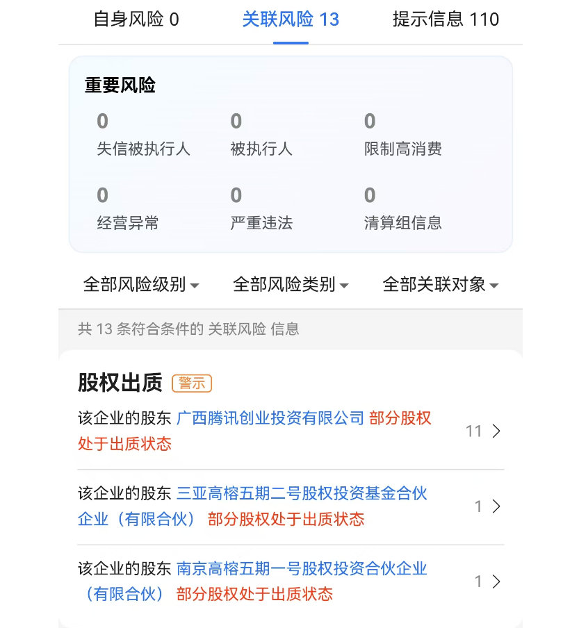目前,由于股东广西腾讯风险投资有限公司、三亚高榕五期二号股权投资基金合伙企业(有限合伙)、三亚高榕五期二号股权投资基金合伙企业等13项相关风险 、三家公司的部分股权出质是由南京高榕五期一号股权投资合伙企业(有限合伙)造成的。