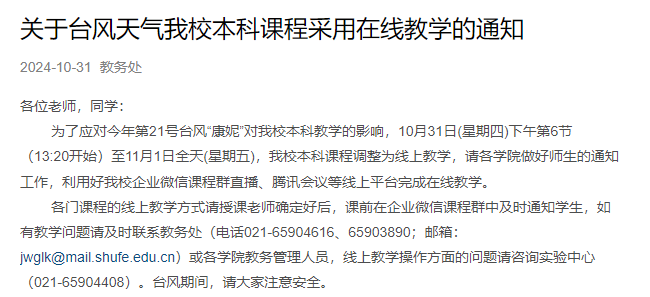 十月三十一日中午,澎湃新闻(www.thepaper.cn)记者从上海财经大学工作人员处获悉,学校已发布课程调整通知:10月31日(星期四)下午第6节(13日),以应对今年第21号台风“康妮”对我校本科教学的影响。:从20开始到11月1日(星期五),我们学校的本科课程调整为在线教学,请各学院做好师生通知工作,利用好我校企业微信课程群直播、腾讯会议等在线平台完成在线教学。