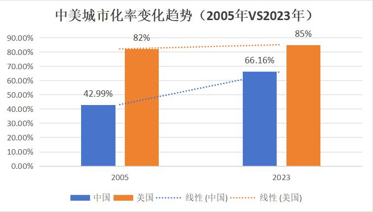 截至2023年底,我国居民城市化率已达66.16%,但早在2005年左右,美国的城市化率就达到了82%。