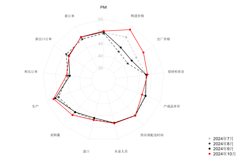 在评论9月份的数据时,我们认为后续供需双弱可能是一个标准情况,但10月份的数据显示,内需可能超出我们的预期,后续内强外弱将成为一个标准情况。现在回顾9月底的市场,我们认为政策的刺激是一方面,内需的修复也是一个非常重要的环节。市场上的先知资金感受到了经济的复苏,所以在政策的配合下,市场暴涨。