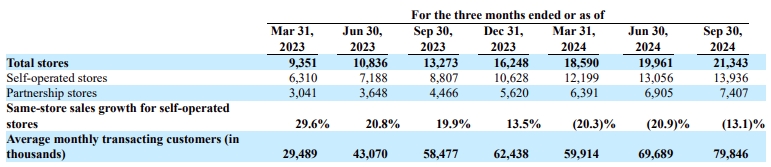 就店铺运营而言,瑞幸咖啡第三季度直营店收入为75.01亿元,比2023年同期的51.41亿元增长了45.9%。第三季度直营店盈利17.46亿元,直营店盈利23.3%,2023年同期盈利11.85亿元,直营店盈利23.1%。第三季度,联营店收入23.41亿元,比2023年同期的18.41亿元增长了27.2%。