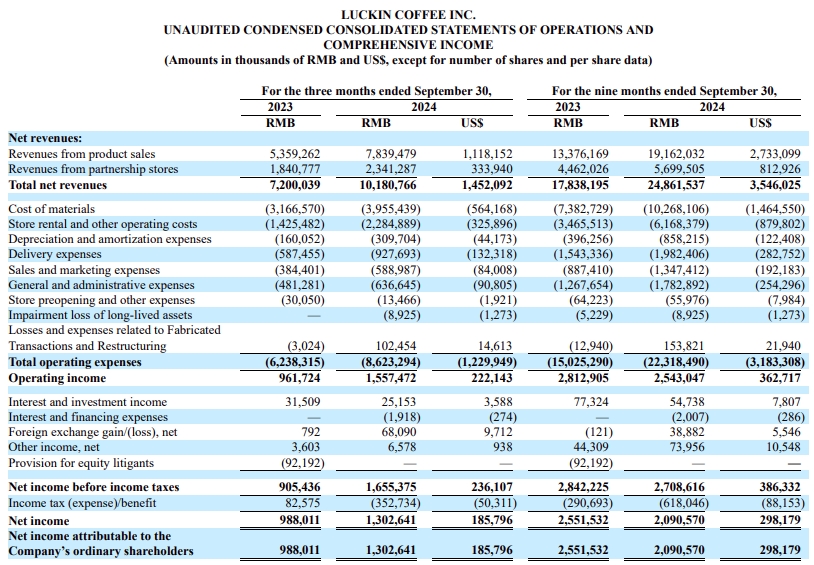近日,瑞幸咖啡披露2024年第三季度报告,第三季度净收入总额为101.81亿元,同比增长41.4%,单季度净收入超过100亿元,净利润达到13.03亿元,创历史新高,同比增长31.8%。