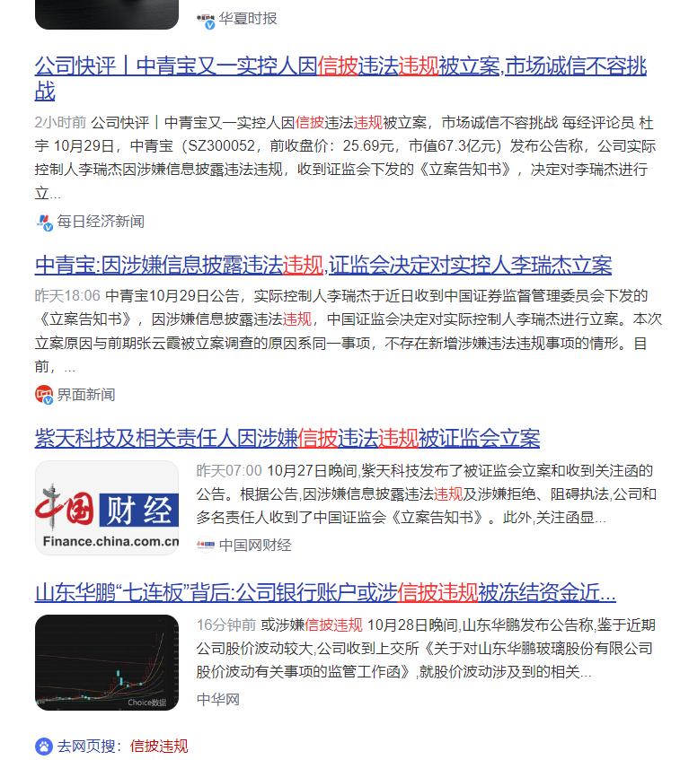 然而,近年来,上市公司在信披方面的违规操作屡见不鲜。百度随便搜了一下,光是这几天的信披违规操作就层出不穷。