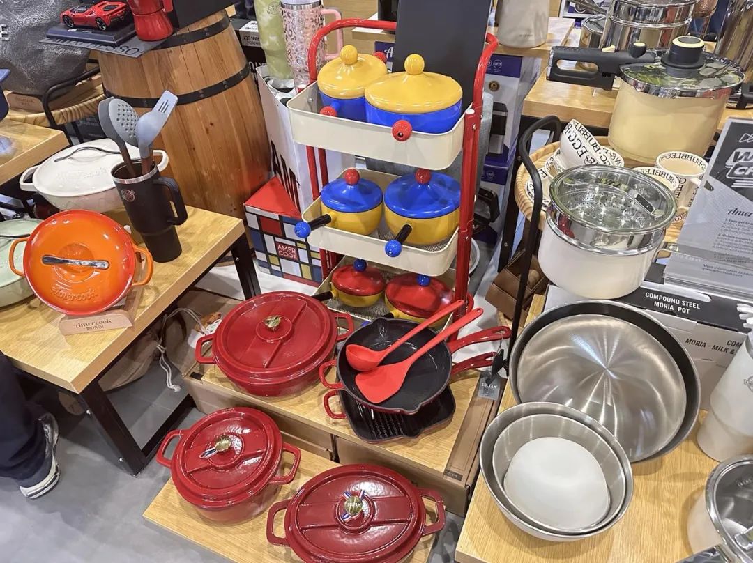 合金锅碗瓢盆是永康另一个有代表性的行业。在厨具锅碗瓢盆公司的明新展厅里,亿邦动力看到货架上摆满了各种各样的炒勺和厨具,展出的产品大多打破了大家对传统锅碗瓢盆的固有认知。锅碗瓢盆不仅可以是金属的原始颜色,还可以是唐老鸭的配色、鳄梨的颜色、橙色的渐变颜色等。,更符合城市年轻人的审美。