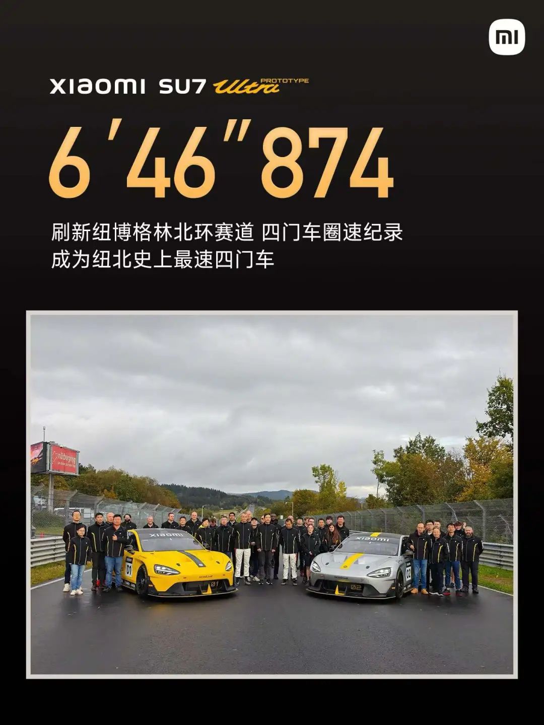 十月二十九日,小米SU7,总马力达到1548PS的双V8s加V6s三电机系统(其中V8s是小米自主研发的) 在纽伯格林北环赛道首秀中,Ultra原型车以6分46秒874的官网认证圈速成绩,成为世界上最快的四门车。