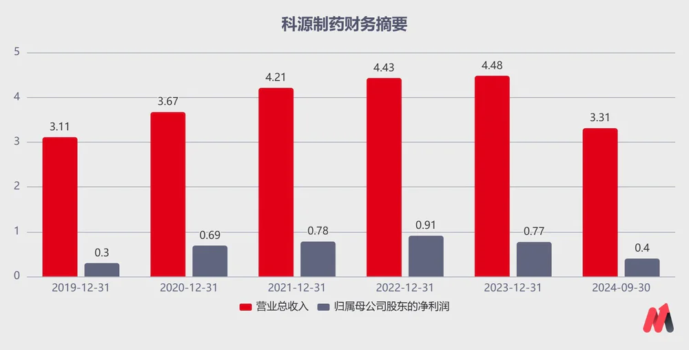 这种经营情况也决定了科源制药的业绩也不冷不热。财务报告显示,科源制药过去五年的收入保持在4亿元左右,归属于母亲的净利润约为0.8亿元,整体变化不大。