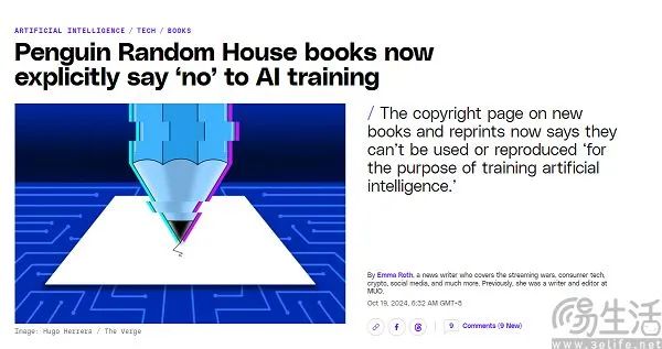但是学生的好日子恐怕也很难长久,最近又有一家大型出版集团宣布拒绝人工智能。据海外科技媒体The日前报道。 根据Verge发布的消息,书籍出版商企鹅兰登书店正在以印刷方式解释人工智能训练的立场。新书和复制书的标准版权页面将注明“本书的任何部分都不能用于或复制人工智能技术或系统的训练。”