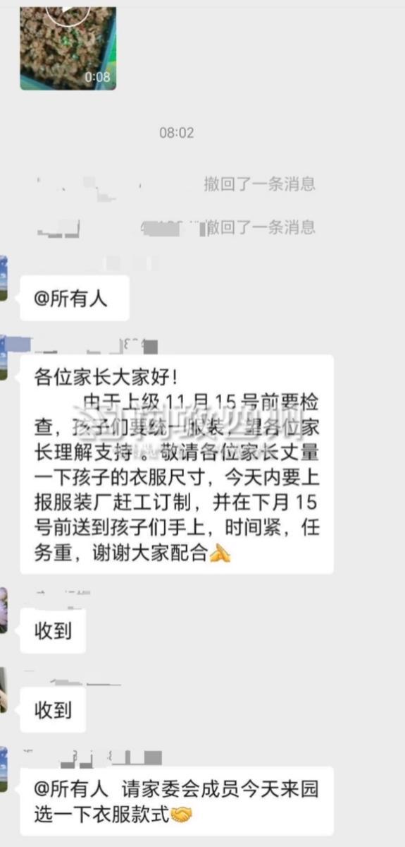 记者从幼儿园大班群聊截图中看到,群主通知家长“ 11 月 15 前几天要检查,孩子要穿统一的衣服,希望家长能理解和支持。请家长及时测量孩子的衣服大小。“然后,群主通知家庭委员会成员选择幼儿园的服装款式。