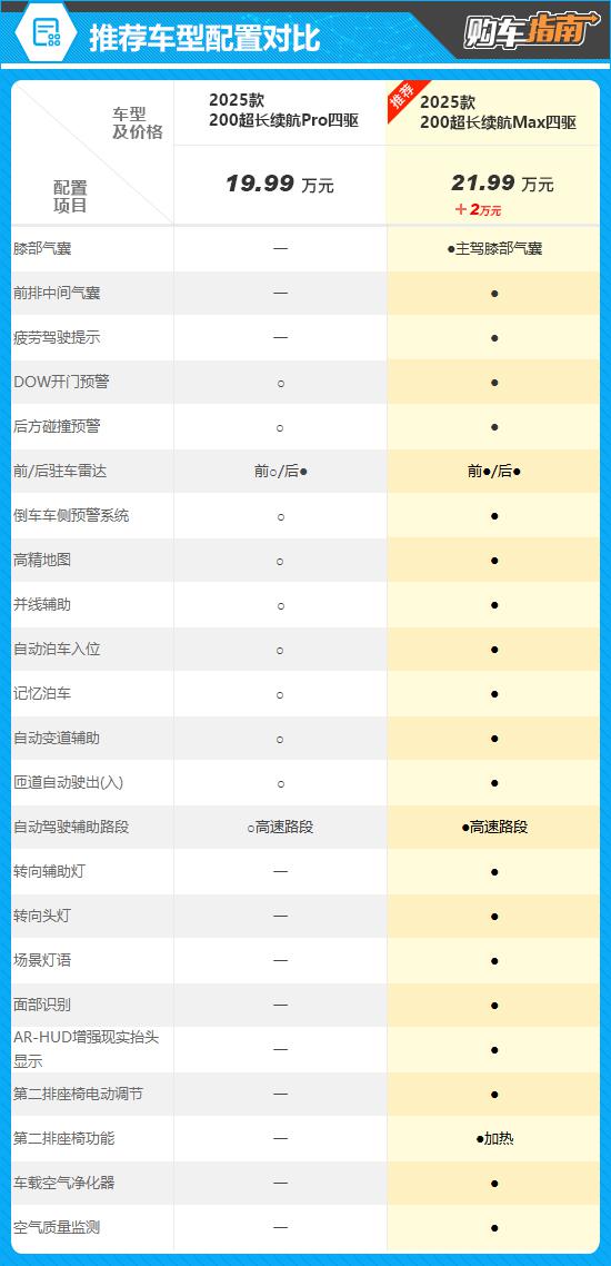 从配置对比来看,推荐车型比入门级车型增加了很多安全舒适的配置,比如前排中间气囊、二排座椅电动调节、二排座椅加热等等。与此同时,需要在入门级车型上加价选择的辅助驾驶功能设备,也成为了自动变道辅助、自动泊车入位等标准。就售价而言,只需增加即可。 2 一万元就可以换上述多种设备,让汽车在性能上得到全面提升,无疑是物有所值。