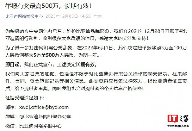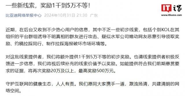 IT 世家 10 月 31 比亚迪网络报道中心今晚发布了一份文件,称收到了热心用户的信息,其中包括个别信息 KOL 组织攻击、水军公司煽动拉踩等线索,将为这些线索提供商提供额外的服务 1 千到 5 初步奖励万不等。