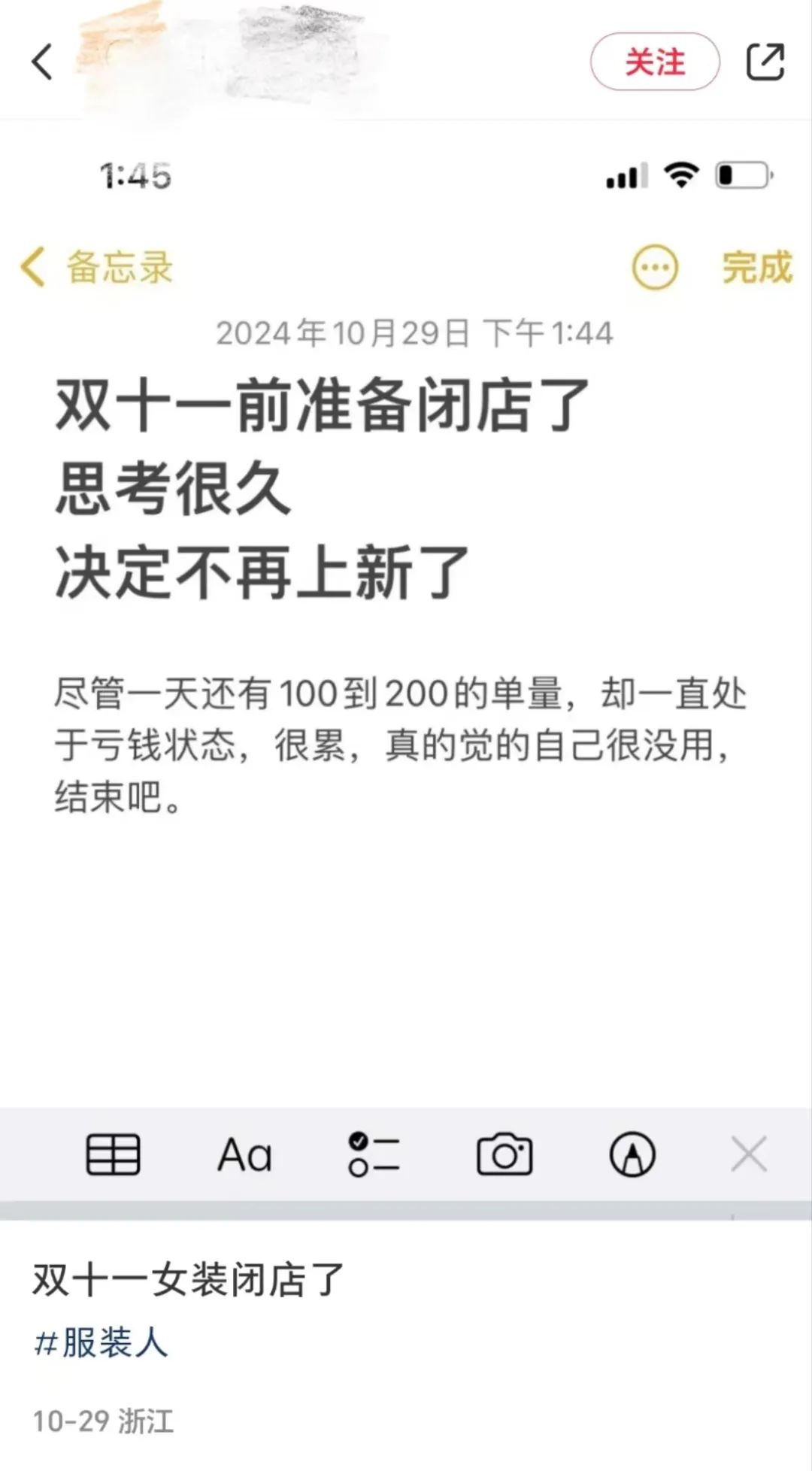 “双十一之前,我要关店了。我想了很久,决定不再创新。”“虽然每天有100到200的订单,但我一直处于亏损状态。我很累。我真的觉得我没用。结束吧。”...