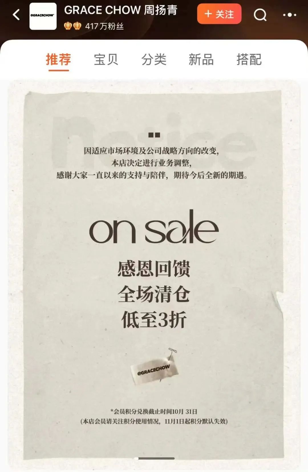 不久之后,网红周扬青的女装店“GRACE CHOW周扬青以“适应市场环境和公司战略方向的变化,决定调整业务”为由,发布了关于全场清仓的通知。