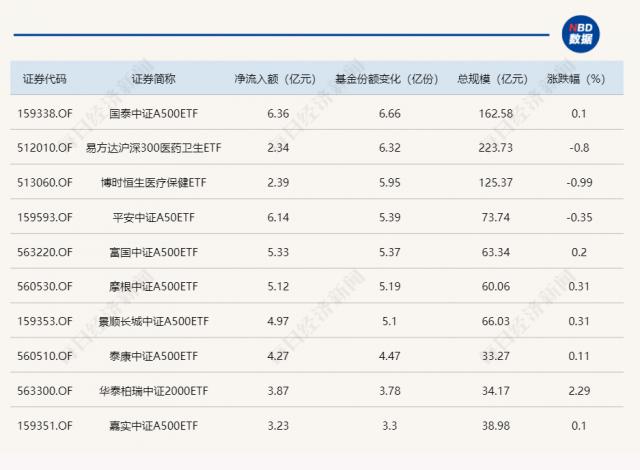 Wind 数据显示,是的 10 月 31 日的非货币 ETF 国泰中证在市场上 A500ETF 基金认购得到加强 6.66 十亿份,净流入 6.36 亿元;沪深易方达 300 医疗卫生 ETF 基金认购得到加强 6.32 亿份,净流入 2.34 1亿元;博时恒生医疗健康 ETF 基金认购得到加强 5.95 十亿份,净流入 2.39 亿元。
