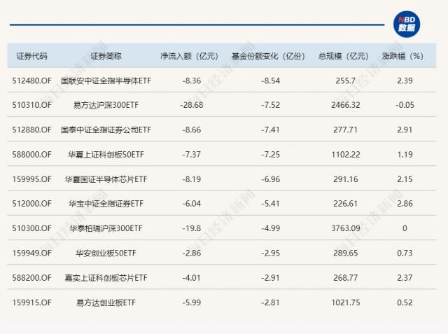 同时,国联安中证全指半导体 ETF 基金认购减少了 8.54 十十十亿份,净流出 8.36 亿元;沪深易方达 300ETF 基金认购减少了 7.52 十十十亿份,净流出 28.68 亿元;国泰中证全指证券公司 ETF 基金认购减少了 7.41 十十十亿份,净流出 8.66 亿元。