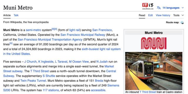 ▲ 在旧金山城市铁路轻轨系统中,维基百科(Muni Metro)的描述