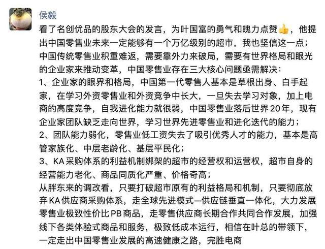 我们应该知道,叶国富在2016年批评阿里对大润发的收购,甚至包括报纸头版,对马云说话,劝他输。2019年,在中国公司未来之星年会上,他甚至直言不讳地说:“大润发一文不值。”。直言不讳的性格让他得到了“叶大炮”的绰号。