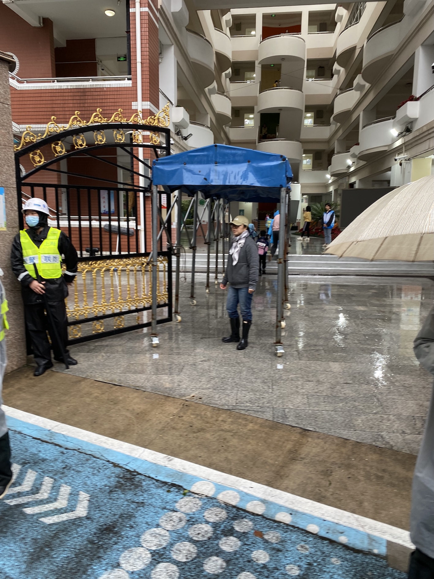 11月1日上午,雨棚已在上海市虹口区第四中心小学校门口搭建。护理学校的保安、老师和志愿者穿上雨鞋和雨衣,准备了一把大伞,并及时将孩子从父母那里收到并护送到校园。