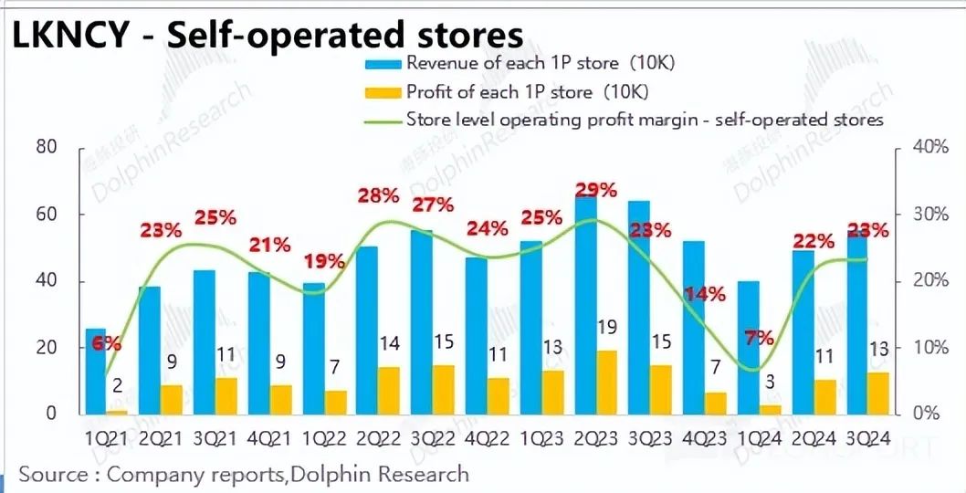 投资者更关心同店的营业额。 Q3 同比下滑 与第二季度相比,13.1%收窄 7.8pct。海豚君认为主要是因为开店速度放缓,新店分流影响减弱。另外,根据我们的计算,直营店单店的收入和净利润在旺季 在减少补贴的背景下,也逐步进步,实现 55 万元、13 一万元,利润率修复到 23%。考虑到去年同期,瑞幸推出了一款爆款酱香拿铁,无论是杯量还是杯量。 ASP 从数量的角度来看,我们认为数量更高, Q3 商店的收入修复情况比较好。