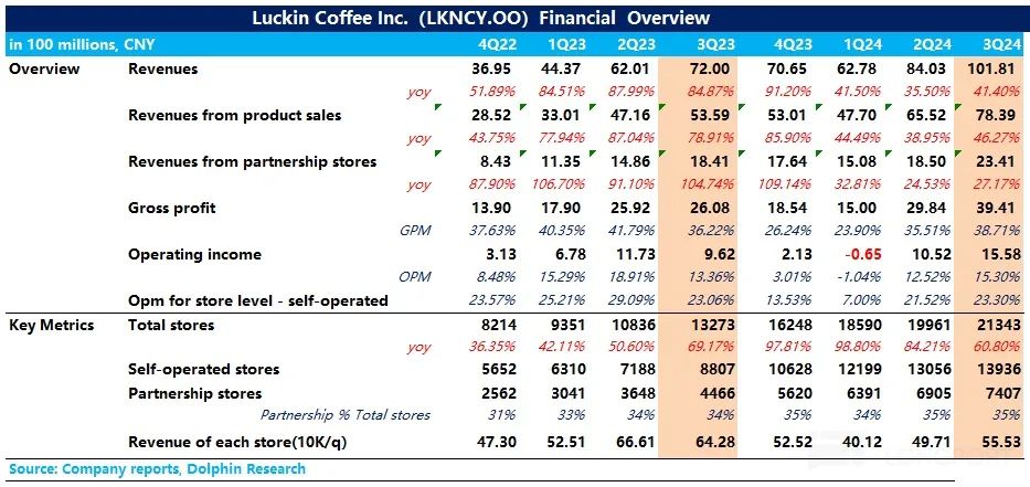 北京时间 10 月 30 日晚美股前,$瑞幸咖啡(ADR).US 公布其 2024 第三季度报告。Q3凭借旺季效应叠加补贴减少, 业绩持续 Q2 持续环比改进,整体表现超出了海豚君的预期。