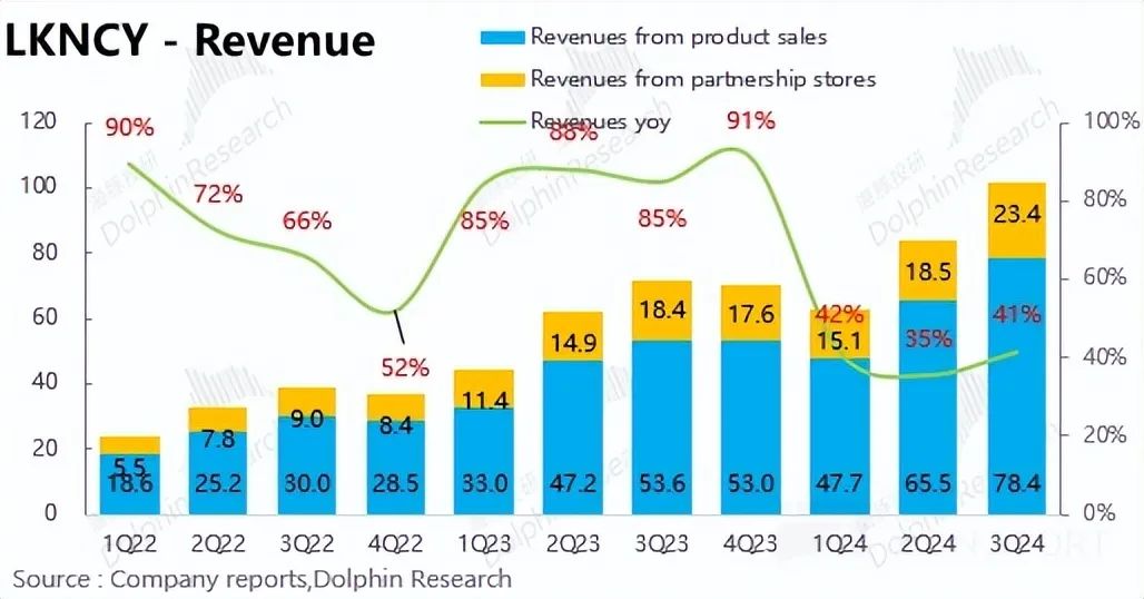 第二季度瑞幸总收入 102 亿元,同比增长 略超预期的41.4%。具体拆分看,直营店实现营收 78 增速环比上升至亿元,增速环比上升至亿元 占营收比例的46.3%进一步提高到营收比例。 77%,主要是直营店不断扩张;加盟实现营收 23 与第二季度相比,亿元的增长率也略有回升。