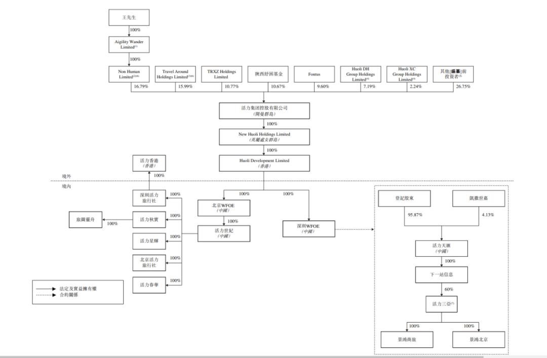 招股书显示,在活力集团上市前的股东结构中,王江通过Non Human Limited 持仓16.79%;通过Travel,李黎军 Around Holdings 15.99%的Limited持仓;上述股权(包括根据李黎军授予王江的投票委托)王江可以行使,还有TRXZ可行使 Holdings Limited拥有2.37%的投票权,总投票权约为35.15%。