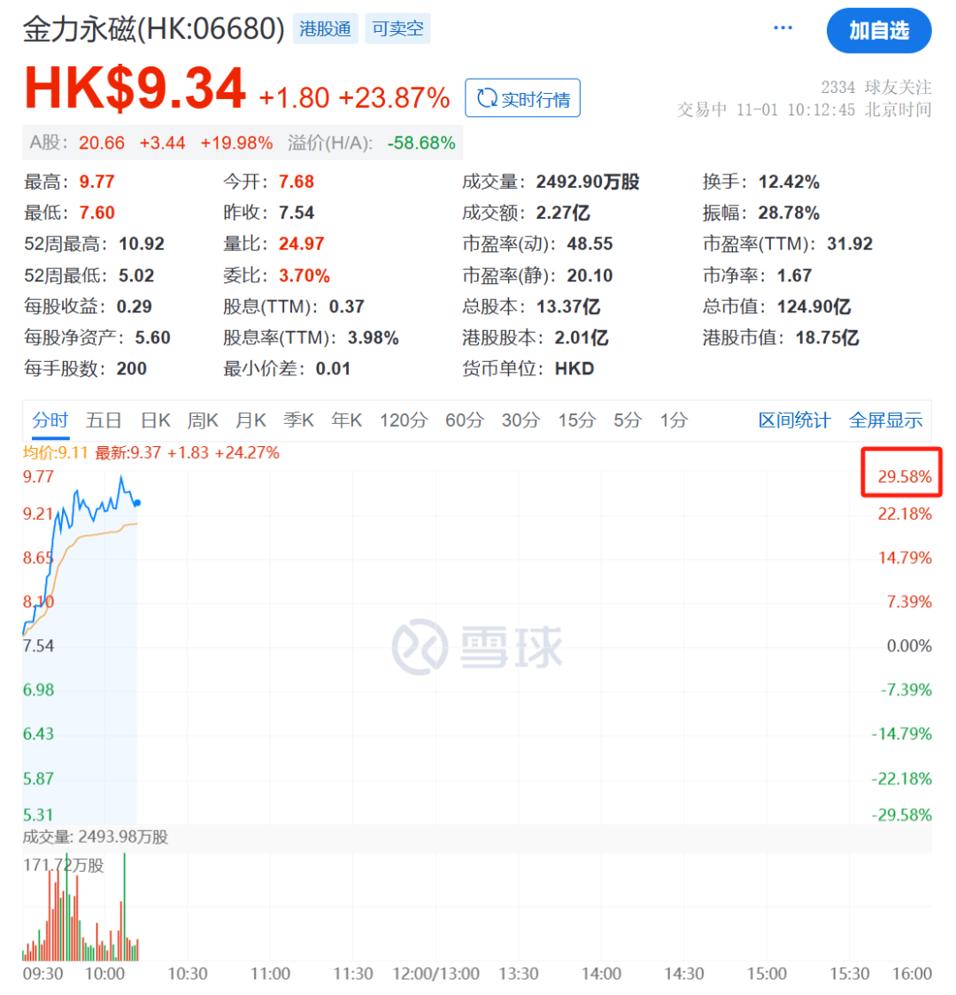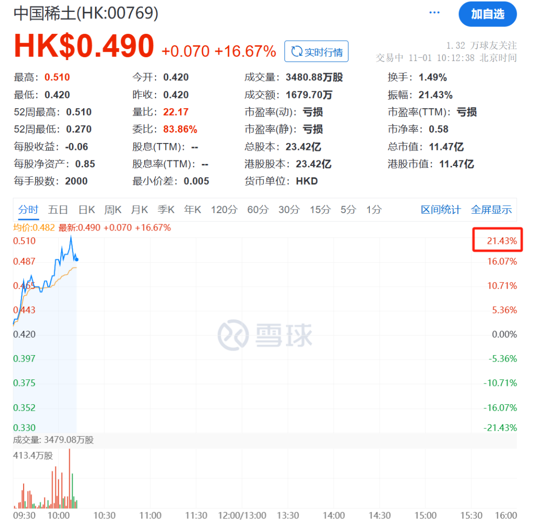 港股稀土概念同步上涨,港股中国稀土上涨21%以上,金力永磁上涨近30%。