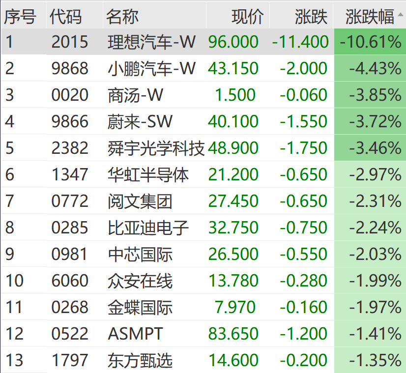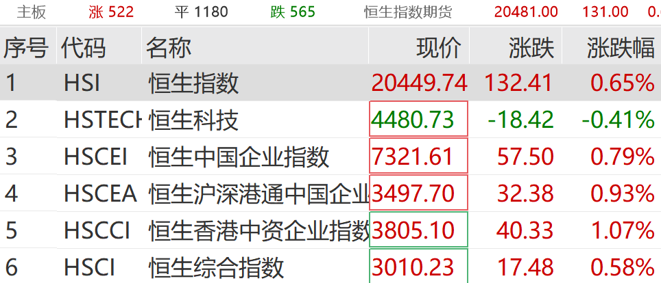 港股三大指数开盘标红:恒生指数上涨0.54%,恒生科技上涨0.12%,恒生国有企业上涨0.65%。上午恒生科技震荡走弱,理想汽车下跌超过10%,领先恒生科技。