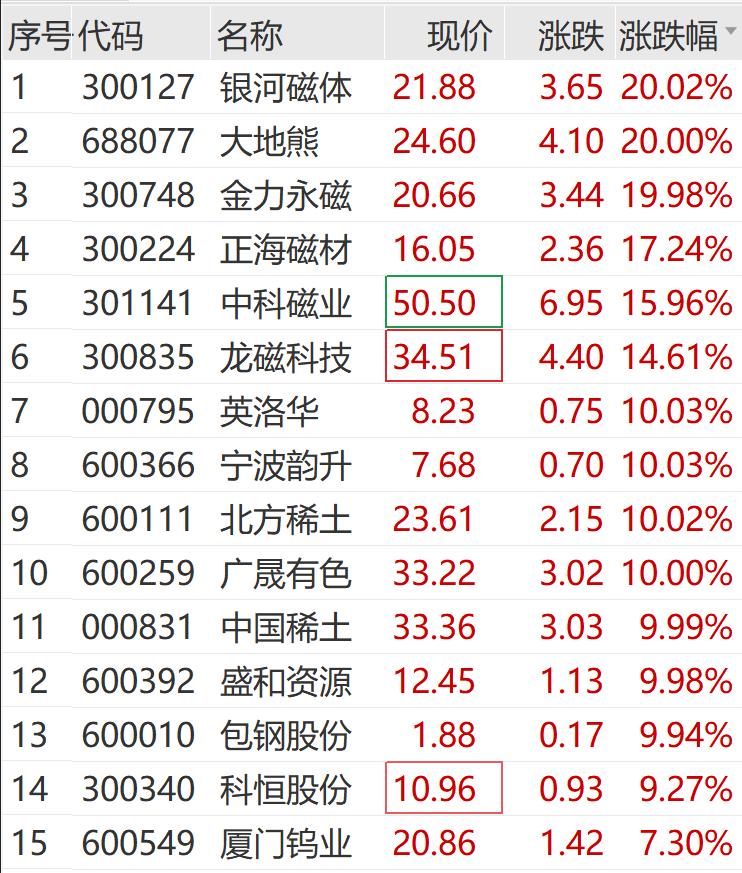 此外,上午稀土、永磁材料等概念集体上涨,英洛华连续两板,银河磁体、大地熊连续20CM涨停,中国稀土、北方稀土、盛和资源连续涨停。