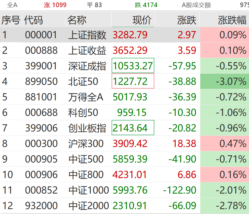 十一月一日,a股上午小幅低开:上证综指3275.58点,跌幅0.13%。;深圳指数下跌0.26%,创业板指数下跌0.67%。上午市场整体窄幅波动,创业板指数下跌超过1%。截至发稿时,a股主要指数绿色多红少,北证50跌幅超过3%。