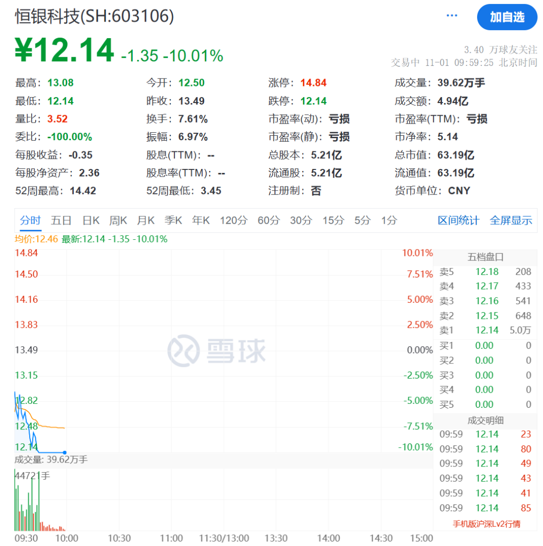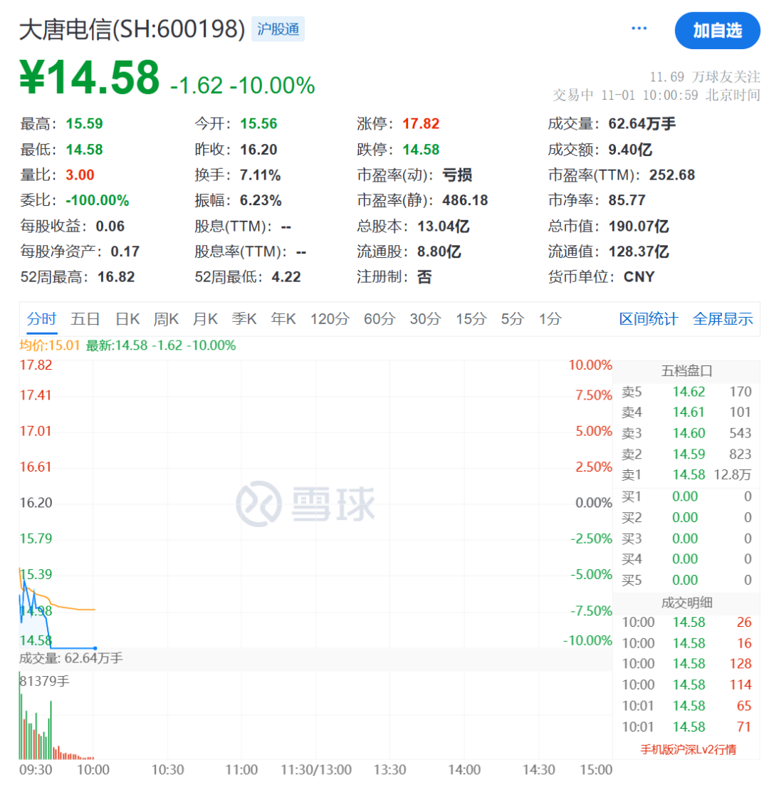 十一月一日,多只热门股票在盘中暴跌,恒银科技、大唐电信、双成药业等盘中跌停。