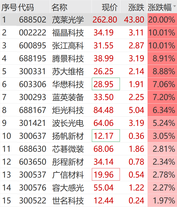 十一月一日,光刻机概念盘开始上涨。茂莱光学20CM涨停,福晶科技、张江高科技涨停,腾景科技、苏大维格、蓝英装备等多芯大涨。