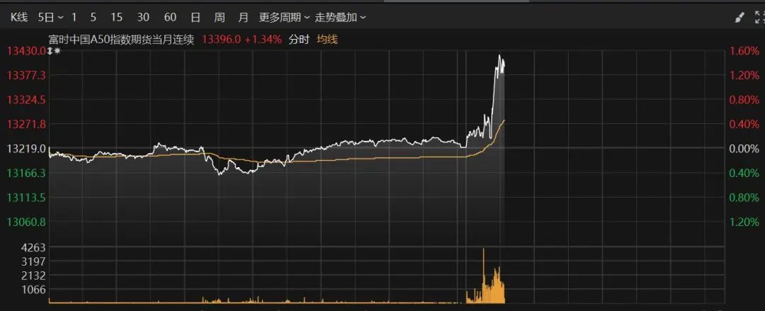富时中国A50指数期货盘迅速上涨,一度上涨超过1%。