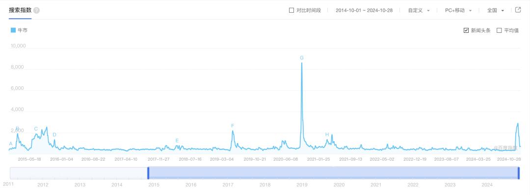 翻看百度搜索指数,从最近一个月开始,人们对“牛市”这个词的关注度仅次于2020年7月。当时上证综指成功突破3300点,创下5年最大单日涨幅。深证综指也大幅上涨,创业板指数也在上涨。