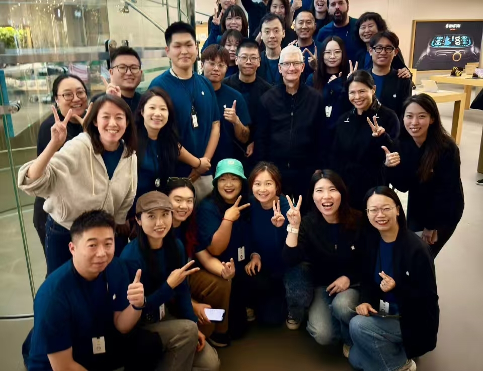 与苹果王府井零售商店的工作人员合影 来源:库克微博
