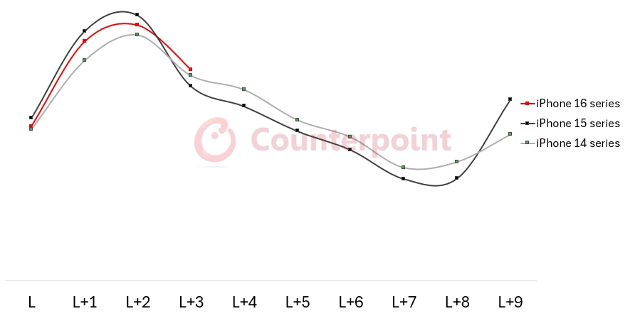 根据Counterpoint数据,iPhone 在美国上市前四周,16系列的初始销售期略低于去年的iPhone。 15系列。