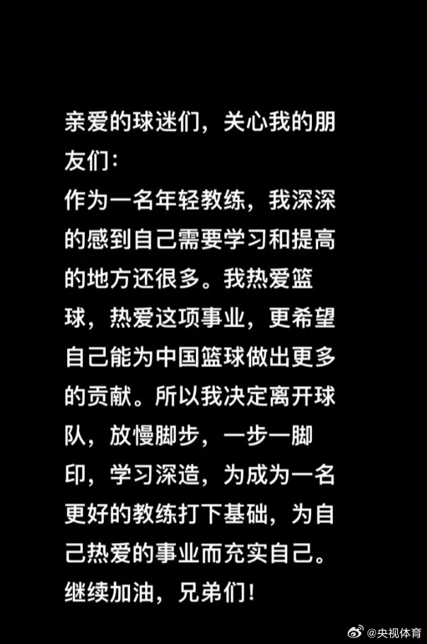 “亲爱的粉丝们,关注我的朋友们,作为一名年轻的教练,我深深地觉得还有很多地方需要学习和提高...于是我决定离开球队,放慢脚步,一步一步学习,为成为一名更好的教练打下基础,为自己热爱的事业充实自己。”