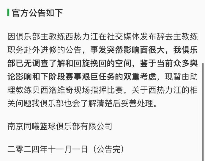 “由于俱乐部主教练西热力江在社交媒体上发布通知,他辞去了主教练的职位,出国留学,事件突然产生了很大的影响。我的俱乐部没有调查和理解和恢复的空间。“从南京第一排苏酒队管理层的公告中不难看出,西热力江的决策并不在他们的预期之内。“鉴于目前众多舆论的影响和下一阶段艰巨任务的多重考虑,助理教练贝西洛维奇现场指挥比赛暂时由俱乐部了解,然后妥善处理西热力江的相关问题。”