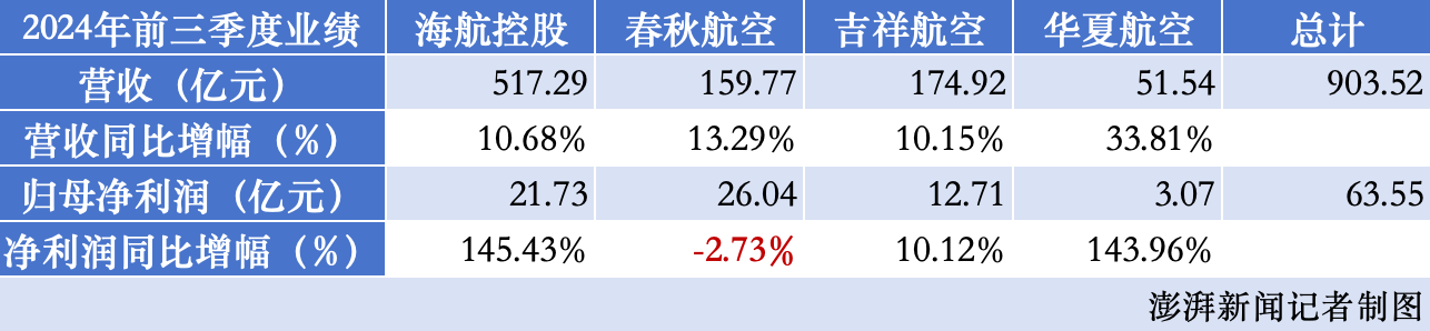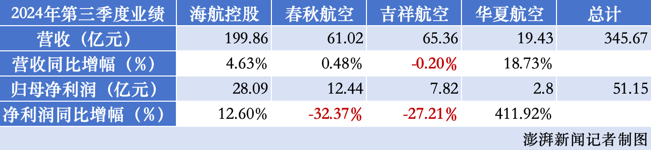 最近,我国国航(60111111).SH)、我国东航(600115.SH)、南方航空(600029.SH)、海航控股(600221.SH)、春秋航空(601021.SH)、吉祥航空(603885.SH)、华夏航空(002928.SZ)2024年第三季度,7家上市航空公司陆续披露业绩公告。