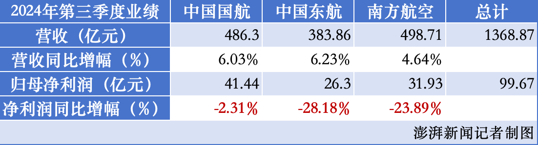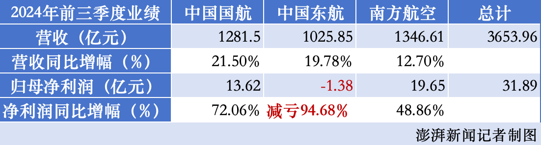 针对今年前三季度的业绩,国航在财务报告中指出,今年前三季度公司营业收入同比大幅增长,国航积极加强成本控制,同比大幅增加利润。南航表示,今年前三季度盈利主要是由于航空市场需求旺盛,营业收入增加。
