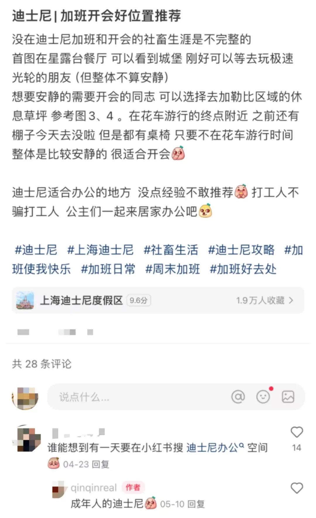 在北京环球度假区或上海迪士尼园区,有不少用户发帖分享自习或加班的最佳位置。