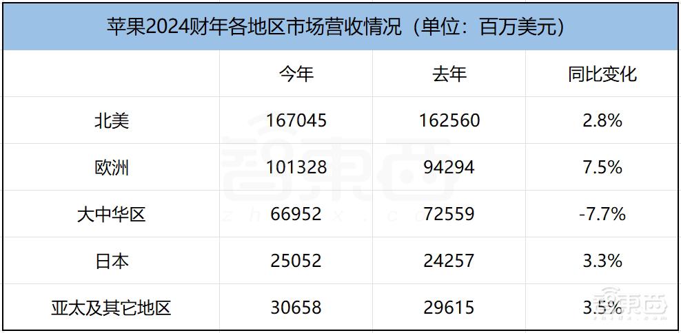 从区域比例来看,苹果北美、欧洲、日本、亚太地区的年营收在第三季度有所增长,但第三季度大中华区市场营收同比小幅下降0.4%。、年收入大幅下降7.8%。