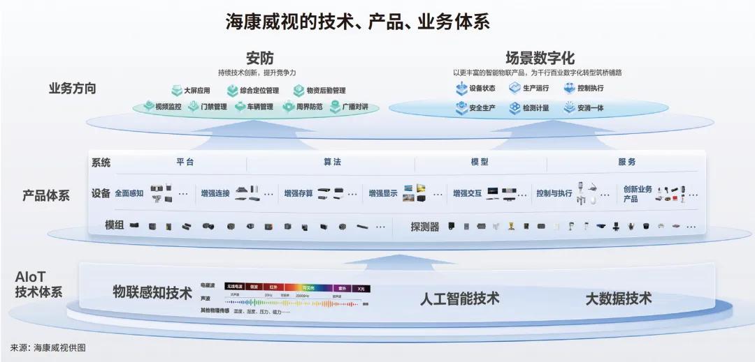 如上图所示,在过去的20年里,海康威视已经建立了一个相对完善的技术、商品和业务体系。顶层是安全和场景数字化两个核心业务方向。中间层是一个广阔的AIoT“技术黑土地”,包括大量的系统、设备和模块产品系统,而支撑这个系统的底层。