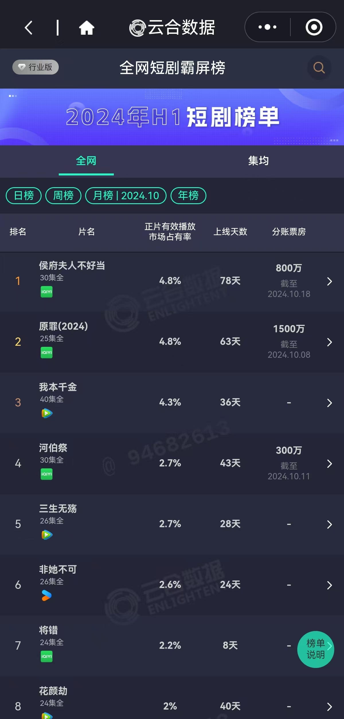 根据云合数据,十月短剧全网整部电影有效播放市场份额前三名:《侯府夫人不好当》《原罪(2024)》《我本千金》。